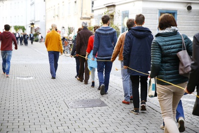 Wir brechen auf zu einer Expedition, wandern auf Wegen durch den urbanen Raum – ein Baustellenband dient uns als Rettungsseil. Während wir in Siedlungsgebieten navigieren, begegnen wir Orten von Transformation, dem Dialog von Schaffen und Zerstören. Wir lagern an unbeachteten Ecken und hören den Stimmen der BewohnerInnen zu und bewundern die verschlungenen Netzwerke dieses lebenden Organismus.