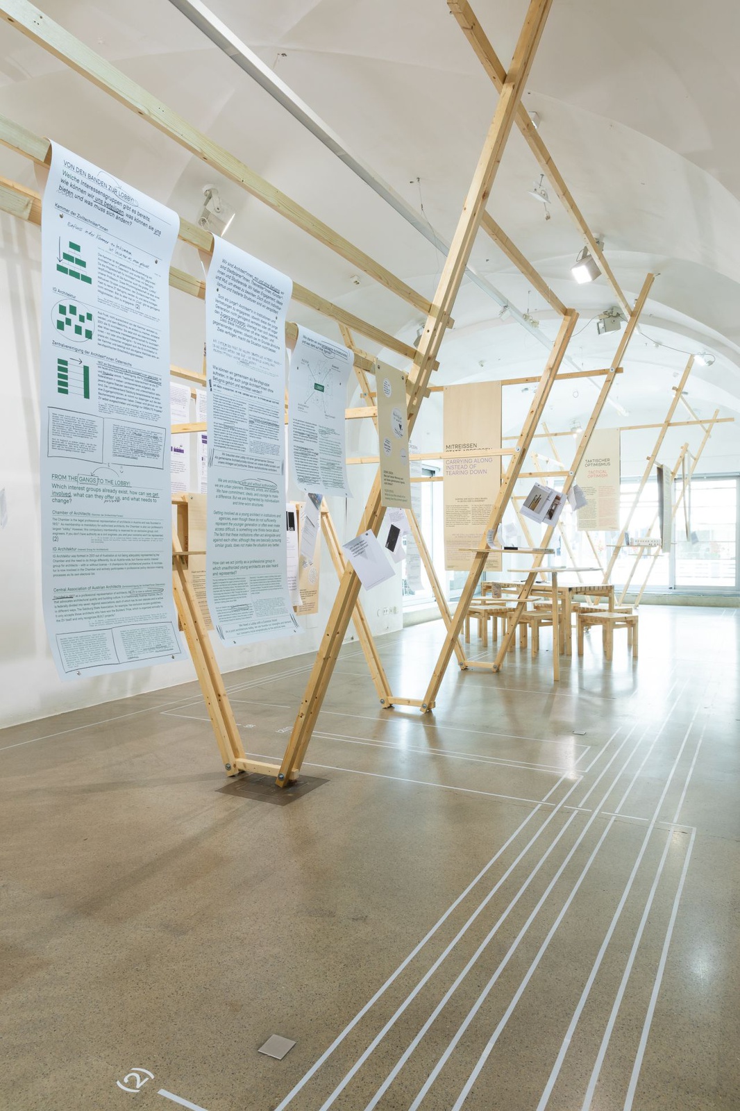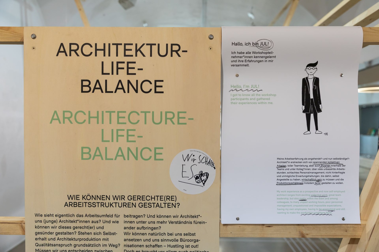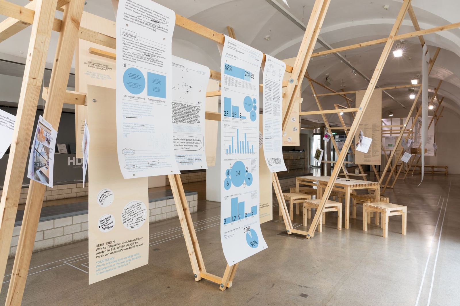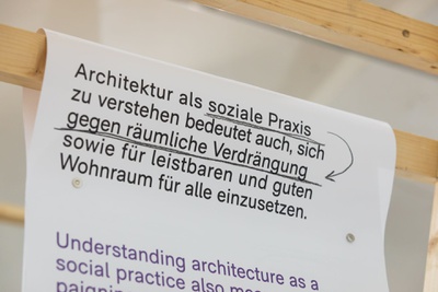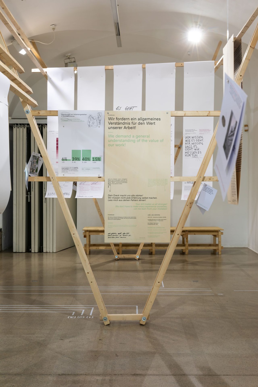 AusstellungDie Ausstellung „Zwischen Kostenschätzung, Muttermilch und Bauwende“ versammelt die drängendsten Fragen, Positionen und Forderungen junger Architekt:innen in Österreich. Die Herausforderungen sind groß: die Bauwende aktiv mitgestalten, gerechtere Arbeitsstrukturen schaffen und die eigenen Handlungsspielräume durch veränderte Rahmenbedingungen vergrößern. Gezeigt wird ein kollektiv kuratiertes Mapping, das gemeinsam mit 60 Architekt:innen erarbeitet wurde und den Auftakt zu einer offenen Diskussion bildet. Die Installation lädt zum Austausch ein, stellt Fragen und soll durch Kommentare der Besucher:innen weiter wachsen.