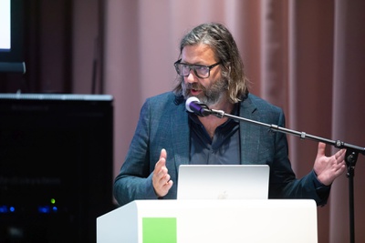 Vor der Eröffnung der Ausstellung "Speculations – Peter Cook, London" hielt Sir Peter Cook, einer der Architekten des Kunsthauses Graz, am 22.10.2023 einen Vortrag zu seiner Arbeit. || Before the opening of the exhibition "Speculations - Peter Cook, London", Sir Peter Cook, one of the architects of the Kunsthaus Graz, gave a lecture on his work on 22 October 2023.