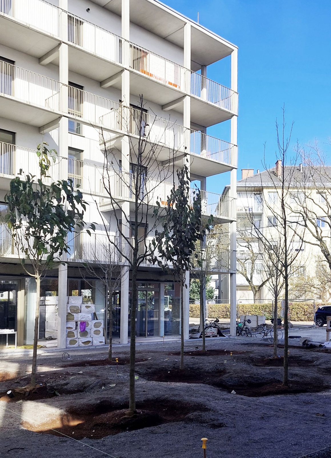 Die Wohnbebauung, eine Gruppierung von fünf Punkthäusern mit verschiedenen Höhen, reagiert städtebaulich auf die umgebende Bebauungsstruktur, die vorwiegend aus Einzelobjekten unterschiedlicher Größen und Höhen besteht. Es entsteht ein vielschichtiges Außenraumangebot mit differenzierten Übergängen von öffentlichen zu halböffentlichen und privaten Freibereichen.