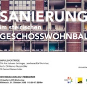 Aufgrund der aktuellen Corona-Situation wird der 3. WOHNBAU.DIALOG STEIERMARK erstmals als virtuelle LIVE Veranstaltung durchgeführt. Dieser Stakeholder-Workshop befasst sich mit dem Thema Wohnbausanierung. Hierzu werden VertreterInnen von Land und Stadt sowie WohnbauträgerInnen und Fachleute für Sanierungen eingeladen sich einzubringen. Anmeldung bis 21. Oktober, 14:00 unter kontakt@wohnbaudialog.at